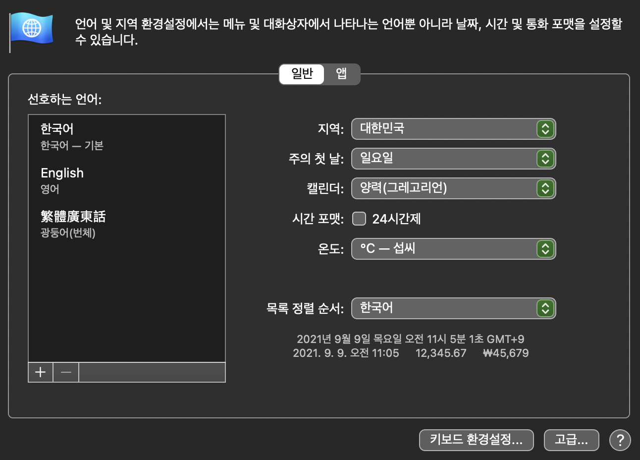 언어설정은 맥용은 한국어가 지원되지 않으므로 영어를 다른 외국어보다 위로 올려주는게 좋다. 만약에 이미지에서 확인되는 광동어 번체를 영어보다 위에 위치시키면 영어 대신 홍콩식 중국어를 보게 될것이다.